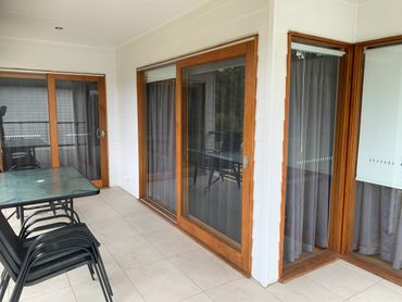 Multiple sliding doors access the semi wrap around tiled outdoor deck.
