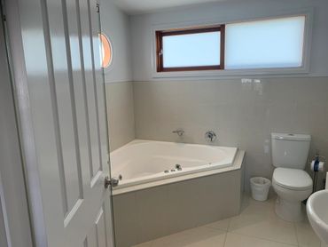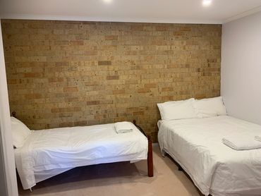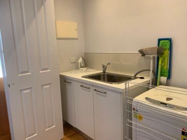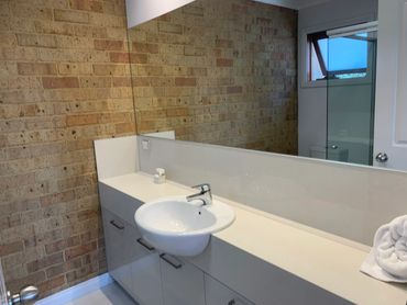 A second bedroom with one double and one single a bathroom with large vanity space and shower. Laundry cupboard with washing machine.